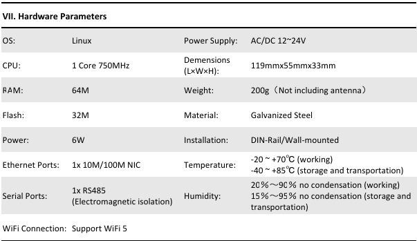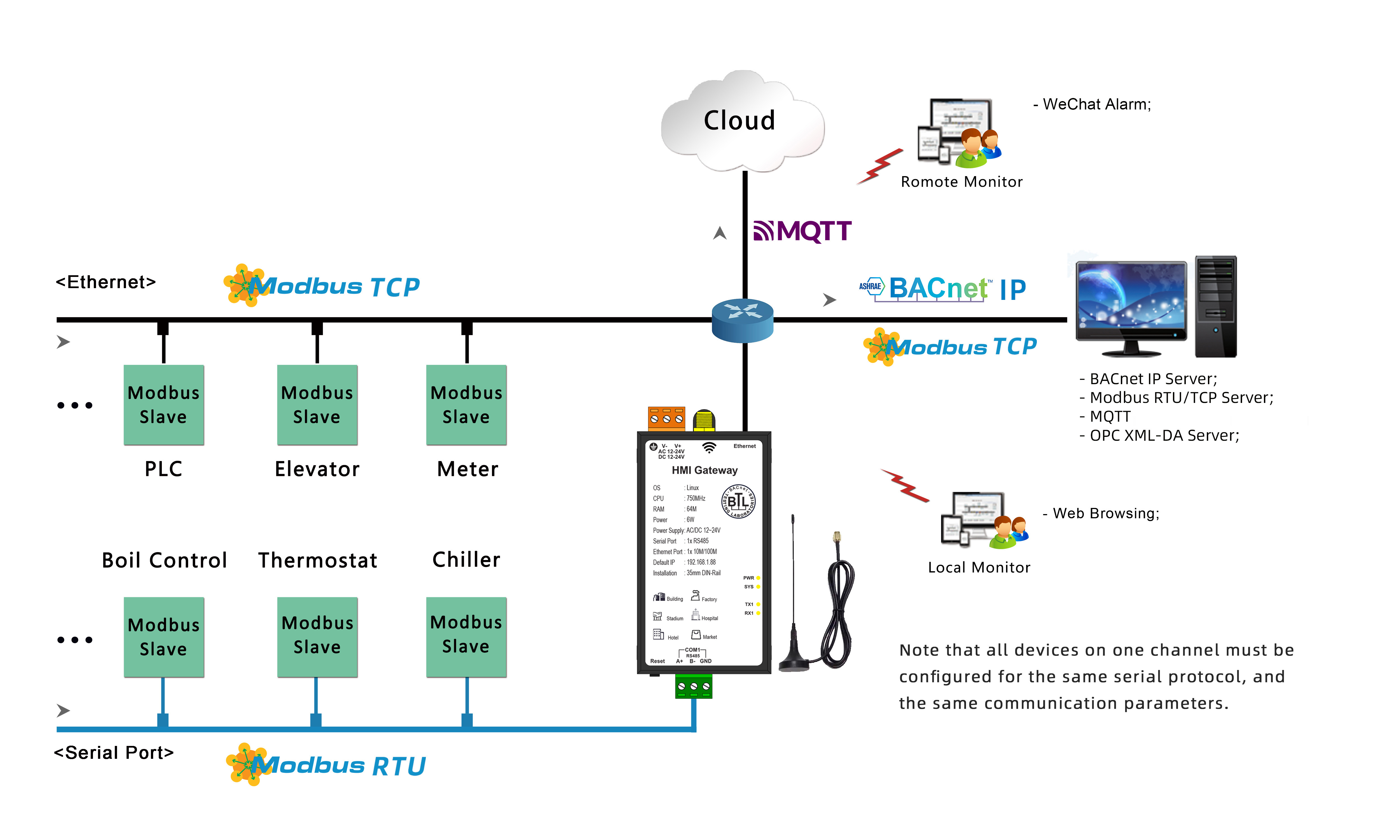 The IoT gateway HMI1001-ARM-WiFi (with 1 Ethernet port, 1 RS485 serial port, dynamically supporting 256 points) supports the collection of Modbus RTU/TCP and more than 500 protocols, simultaneously forwarding it to BACnet IP and Modbus RTU/TCP servers. It also features WeChat Alarm, MQTT server and the ability to upload projects to the cloud.