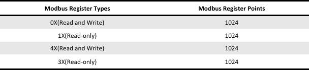 The Modbus gateway supports Modbus RTU/TCP servers. The supported register types and maximum number of points for the server are listed in the table below. Note: The number of gateway registers is dynamically supported, with each type of register capable of supporting up to the total number of points supported by the gateway.
