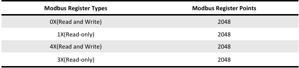 SNMP gateway supports SNMP servers. The supported register types and maximum number of points for the server are listed in the table below.