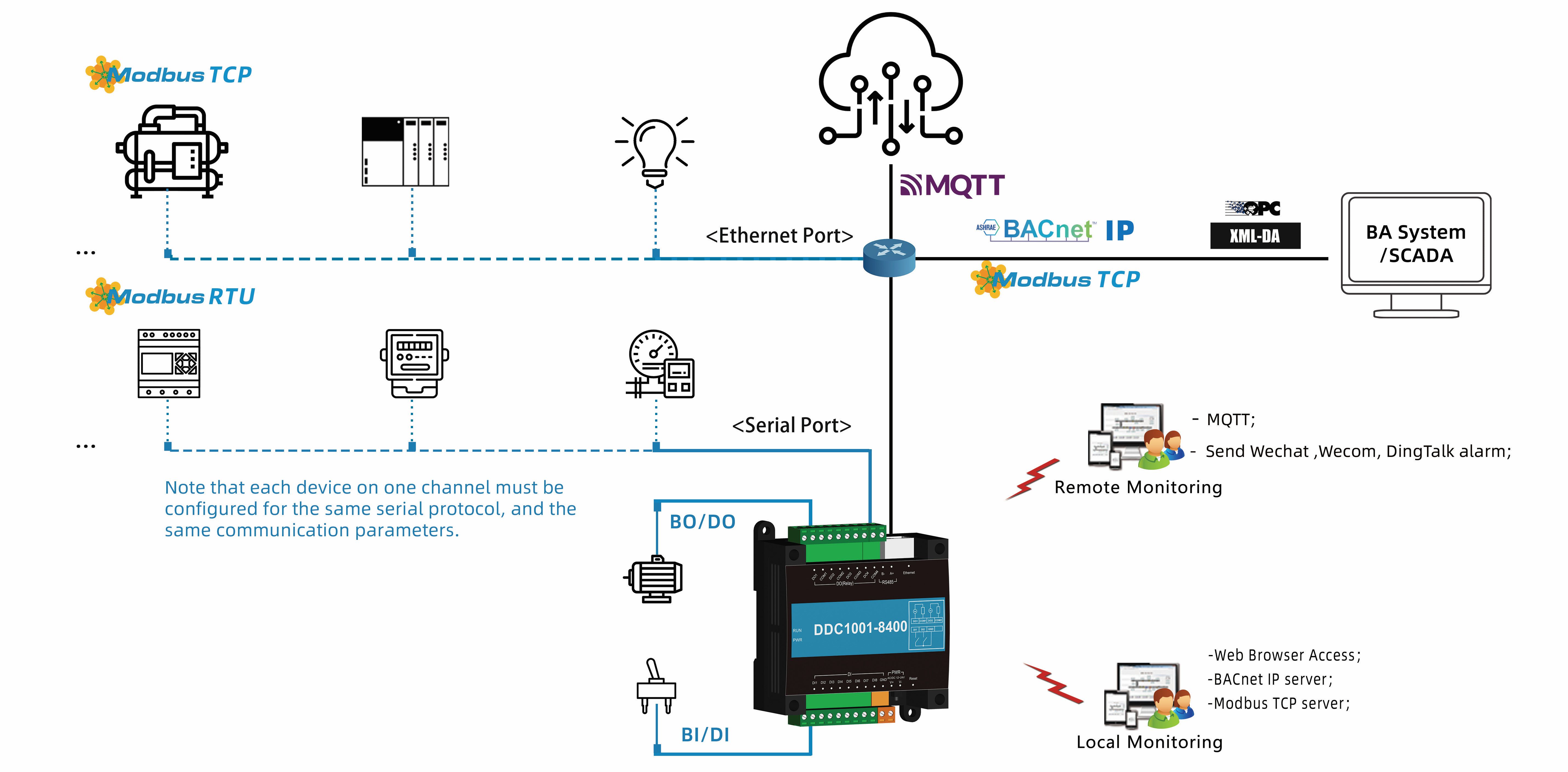 DDC Module DDC1001-8400 (1 ethernet, 1 serial port, 8DI, 4DO, dynamically supports 256 points) only supports collecting Modbus RTU/TCP and Simulator driver, and convert it to BACnet IP and Modbus TCP servers simultaneously. Using X2View software to make the project(can¡¯t make configuration pages). User can configure the project according to the communication protocol document of on-site Modbus RTU/TCP device , and convert it to a standard BACnet IP and Modbus TCP server. After monitoring successfully on the local monitor mode, upload the project file to DDC module to access the data of on-site device (Note: The decimal address of the collection end starts from 1 (Base1), and the hexadecimal address starts from 0 (Base0); The Modbus register base address of the transfer end starts from 1 (Base1)
