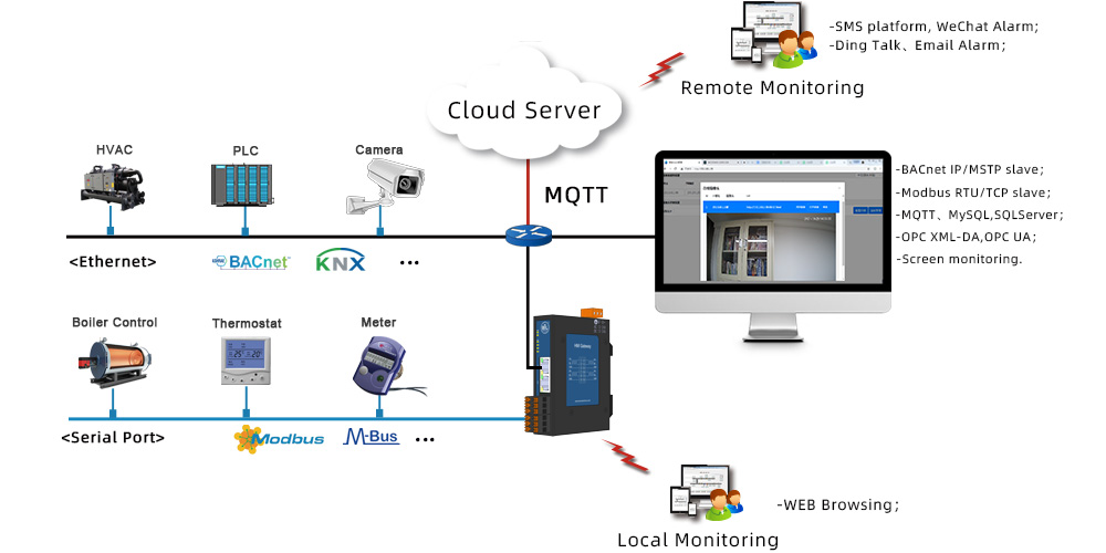 HMI2004-BMS, integrates all functions of web configuration gateway HMI2004-ARM and BMS Gateway MMG2004-A9. In addition to realizing remote monitoring of configuration images, cameras supporting GB/T 28181 and RTSP protocol standards (Hikvision, Dahua, Yushi, etc.) can be converted into HTTP protocol to facilitate the gateway to integrate cameras and open them to third-party platforms. You can access the real-time picture of the camera by HMI2004-BMS.