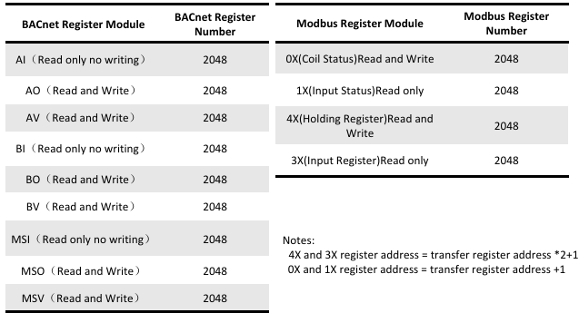 The BACnet/Modbus register types and maximum number of points supported are shown in the table below.