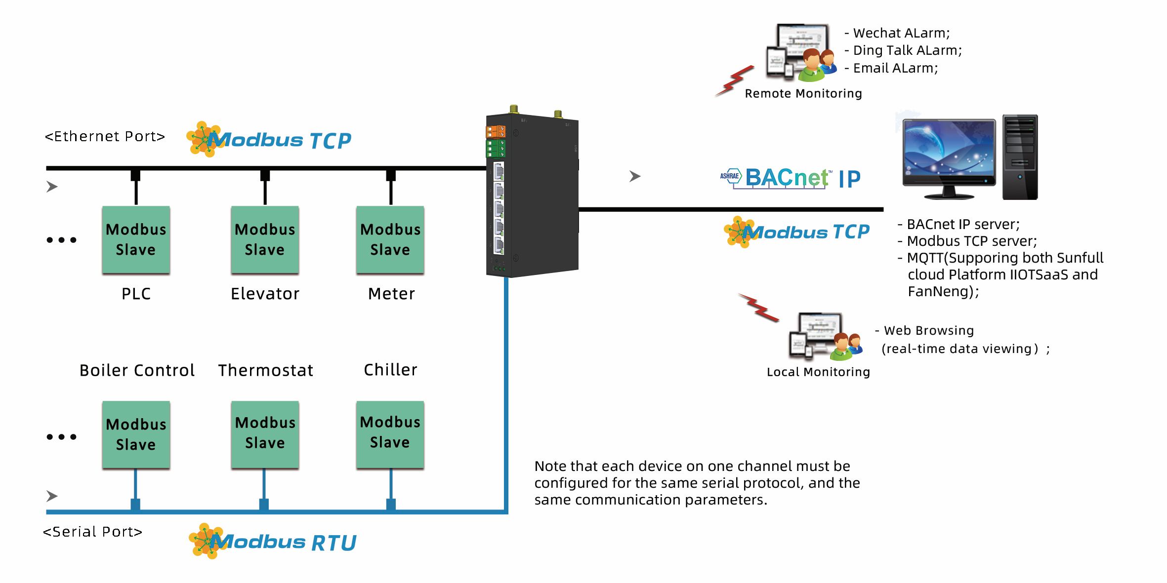 - Support convert Modbus, BACnet IP, OPC UA, Siemens S7 protocols to BACnet IP, Modbus TCP, MQTT server;