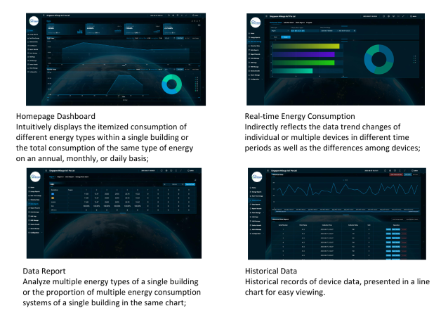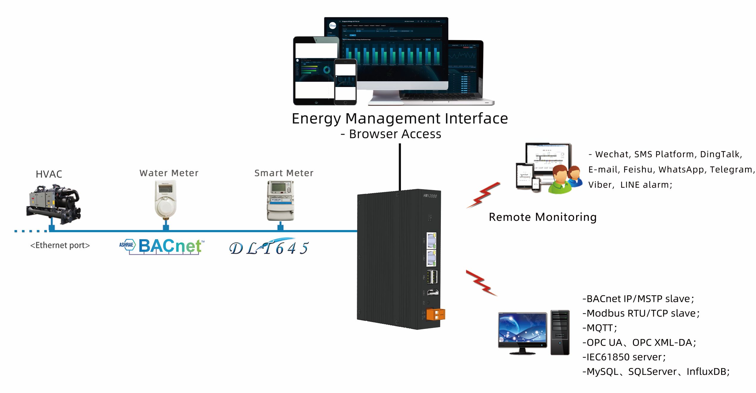 EMS gateway HMI2000-EMS can collect, measure, bill, save and classify data such as water, electricity, gas, cold/hot sources, etc., and has peak, off-peak, valley and flat period electricity consumption records. The data is presented intuitively in the form of tables, pie charts and bar charts.
