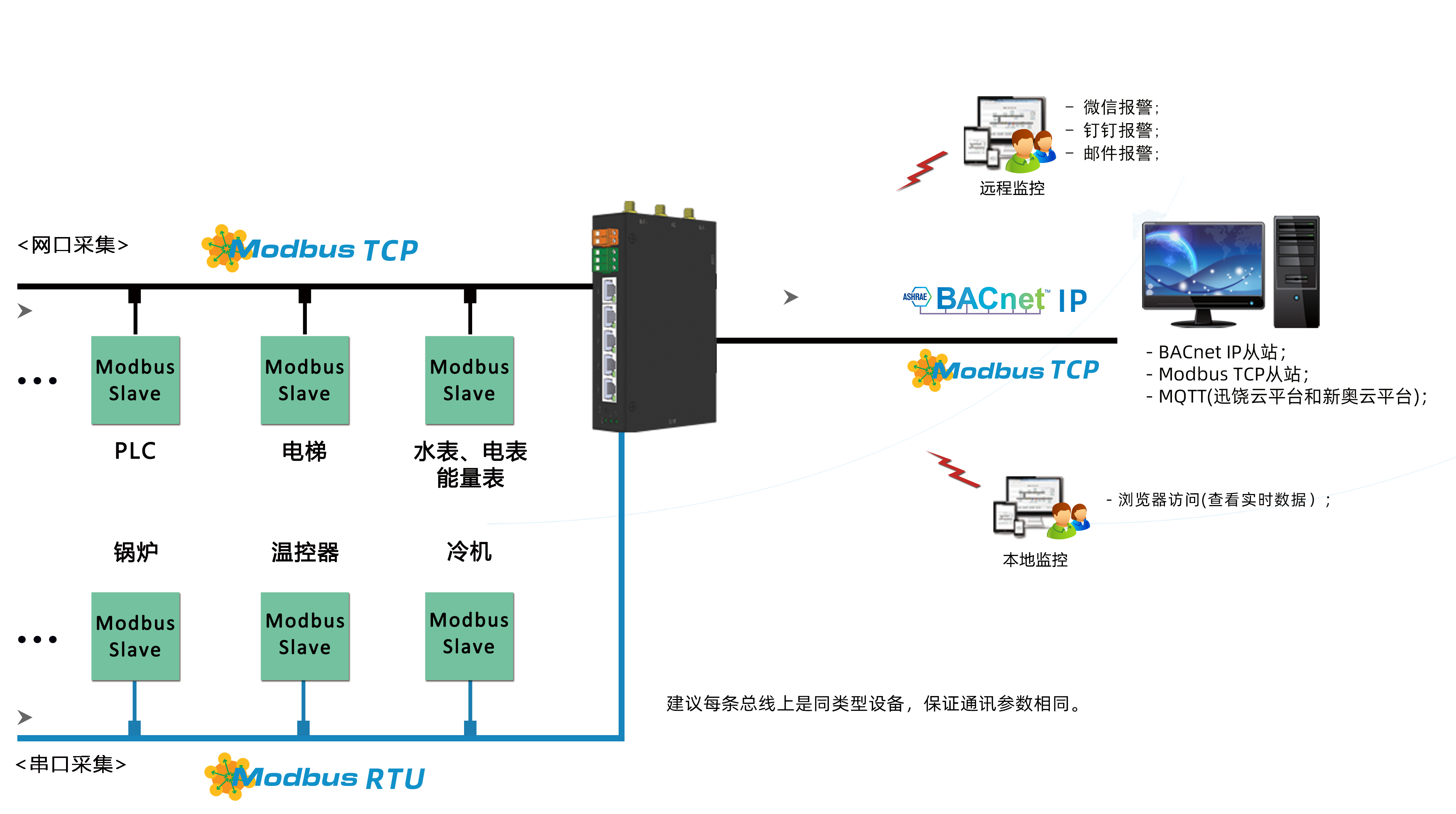 -支持转发为BACnet IP、Modbus TCP、MQTT服务器;