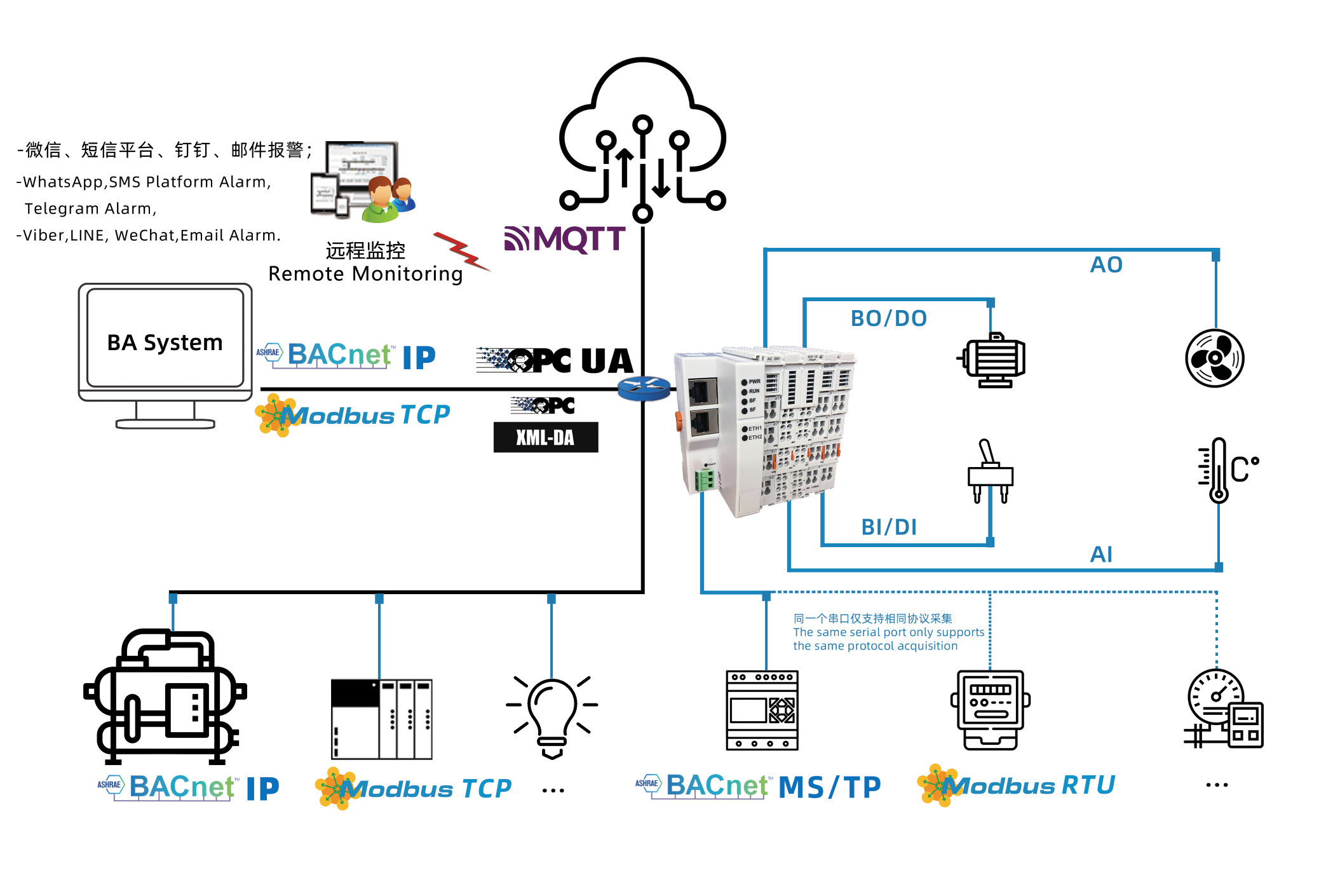 -支持采集Modbus、BACnet协议同时转为BACnet服务器、 Modbus服务器、OPC UA服务器、MQTT服务器;