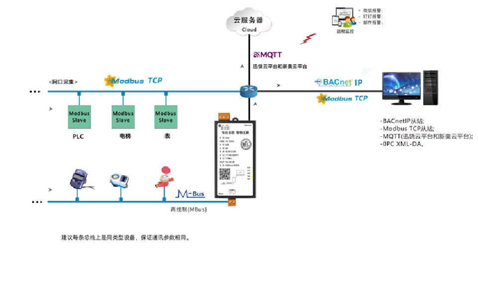 -支持转发为BACnet IP服务器、Modbus RTU/TCP服务器、MQTT服务器(支持迅饶云平台和新奥云平台);