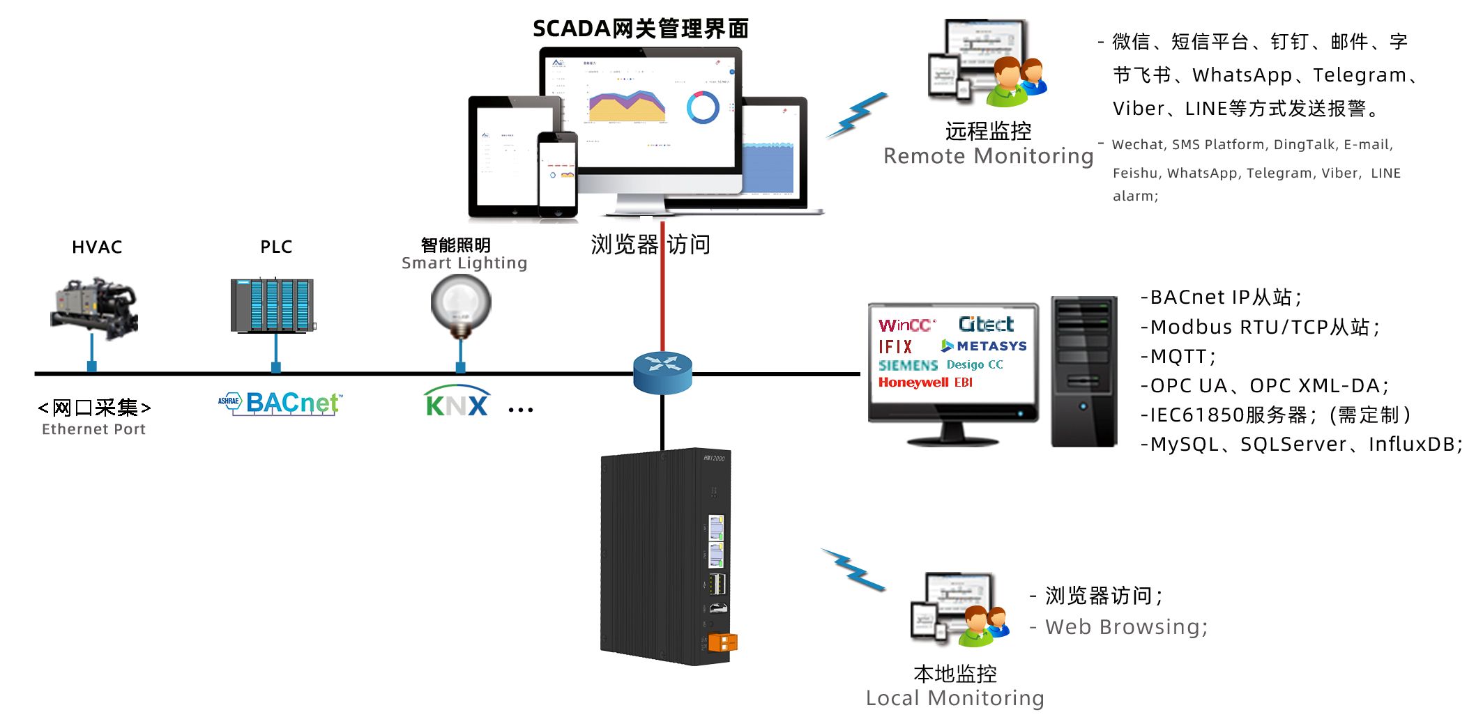同时具微信报警、钉钉报警、邮件报警、短信平台报警、MQTT服务、工程上传云端等功能;支持本地存储InfluxDB时序数据库,也可以存储到外部MySQl数据库或SQL Server数据库;还可以转发为BACnet服务器、Modbus服务器、IEC61850服务器、OPC UA服务器、MQTT服务器,开放HTTP WEB服务被第三方的系统集成。)