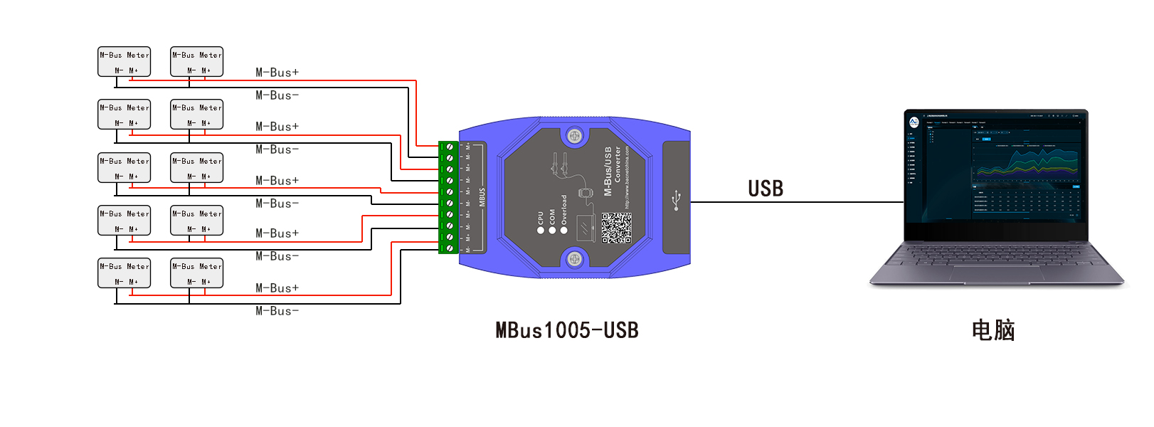 5组MBus总线MBus+, MBus-(建议总共不超过10台设备) |